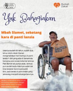 Mbah Slamet senang mendapat sembako keluarga dari Rumah Zakat hari ini karena kata Mbah kadang pemilik panti kesusahan memenuhi kebutuhan makanan para lansia di sini.