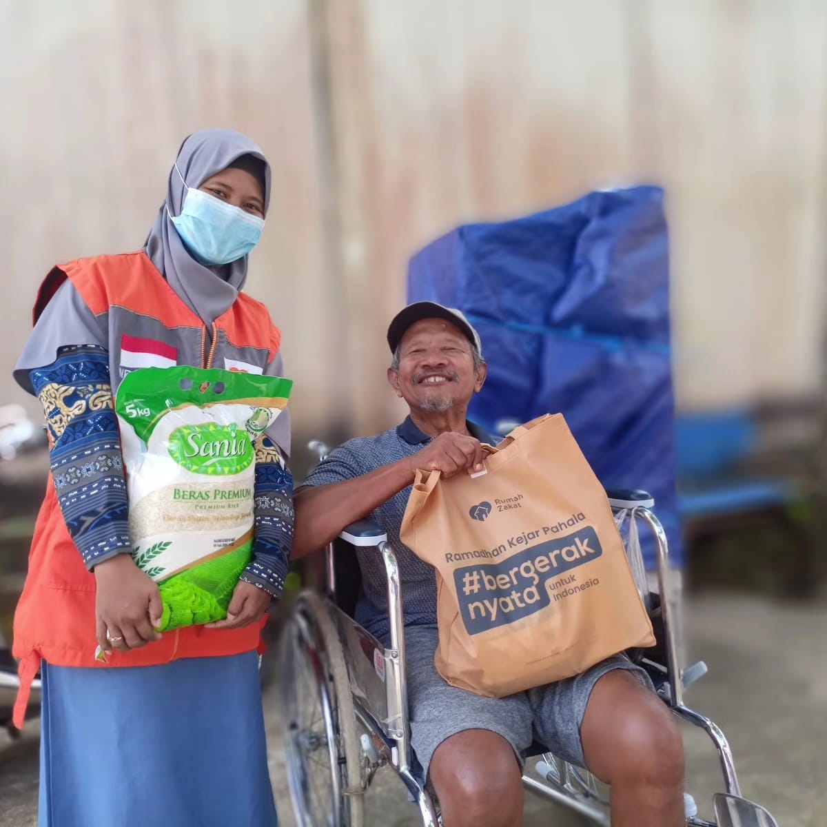 Mbah Slamet senang mendapat sembako keluarga dari Rumah Zakat hari ini karena kata Mbah kadang pemilik panti kesusahan memenuhi kebutuhan makanan para lansia di sini.