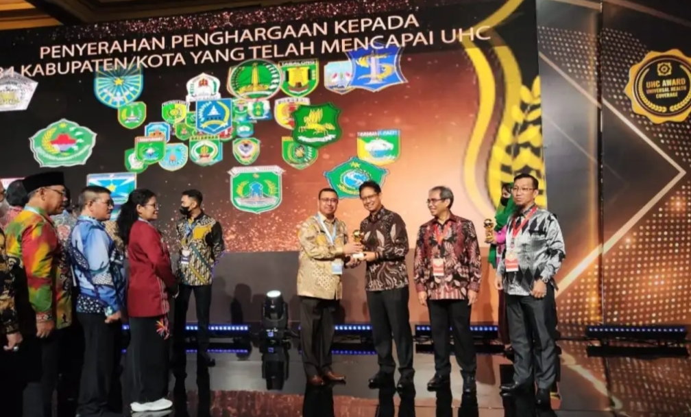 Dengan adanya komitmen itu, Pemkab Kutim bersama dengan 22 provinsi dan 334 kabupaten/kota mendapatkan penghargaan Universal Health Coverage (UHC) dari pemerintah pusat yang diserahkan Wakil Presiden (Wapres) RI KH Ma’ruf Amin di Ballroom Prajurit, Balai Sudirman, Tebet, Jakarta Selatan, Selasa (14/3/2023) pagi. Hadir menerima penghargaan Asisten Pemkesra Seskab Kutim Poniso Suryo Renggono mewakil Bupati Kutim.