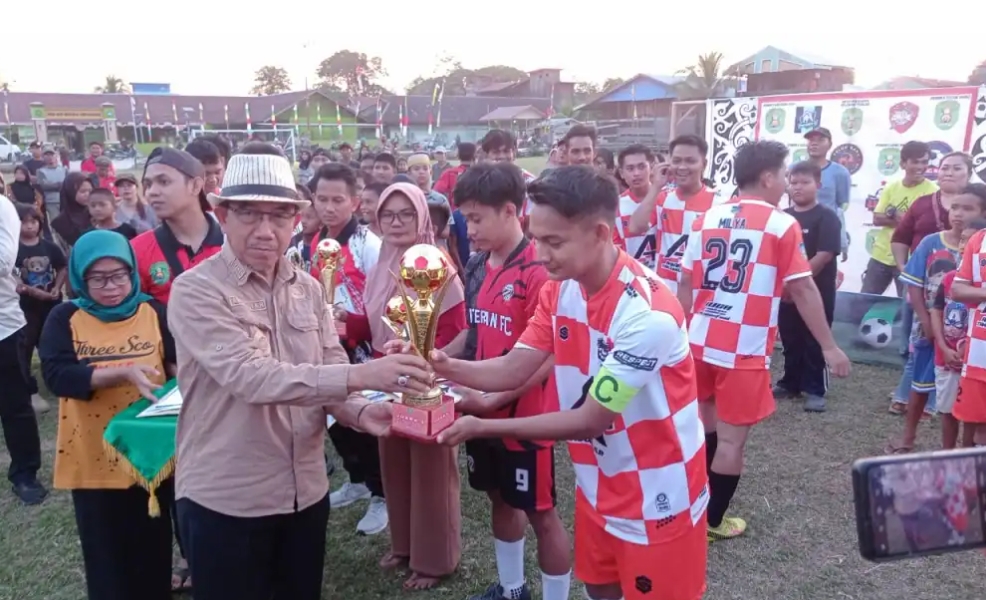 Ardiansyah menyerahkan piala kepada tim pemenang Camat Cup Muara Ancalong. (Foto/ist)