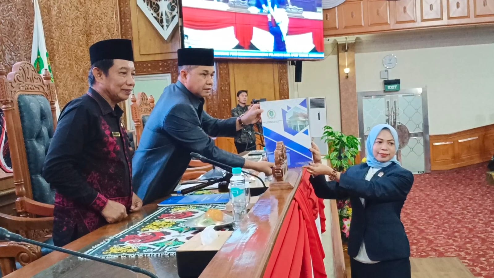 Perwakilan fraksi AKB dalam Dewan, Hj. Mulyana menyerahkan nota penjelasan Raperda tentang Pertanggungjawaban Pelaksanaan APBD. (Ist)