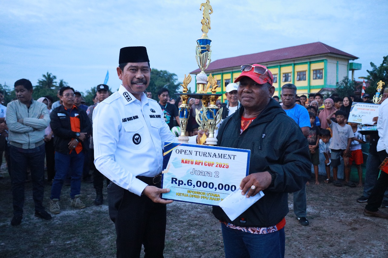 Wakil Bupati PPU Abdul Waris menyerahkan trofi kepada tim Mitra Bhayangkara usai memenangkan final Kayu Api Cup 2025 di Lapangan Kayu Api, Penajam.(ist)